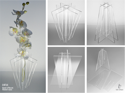 De la série « SANS VIS NI ADHÉSIF», DIÈSE est un vase composé de quatre pièces d'acrylique découpés au laser et d'une éprouvette. L'assemblage se fait tout simplement par le glissement des fentes l'une dans l'autre. Selon la façon dont les pièces sont assemblées résutera d'une forme différente. Disponible bientôt.